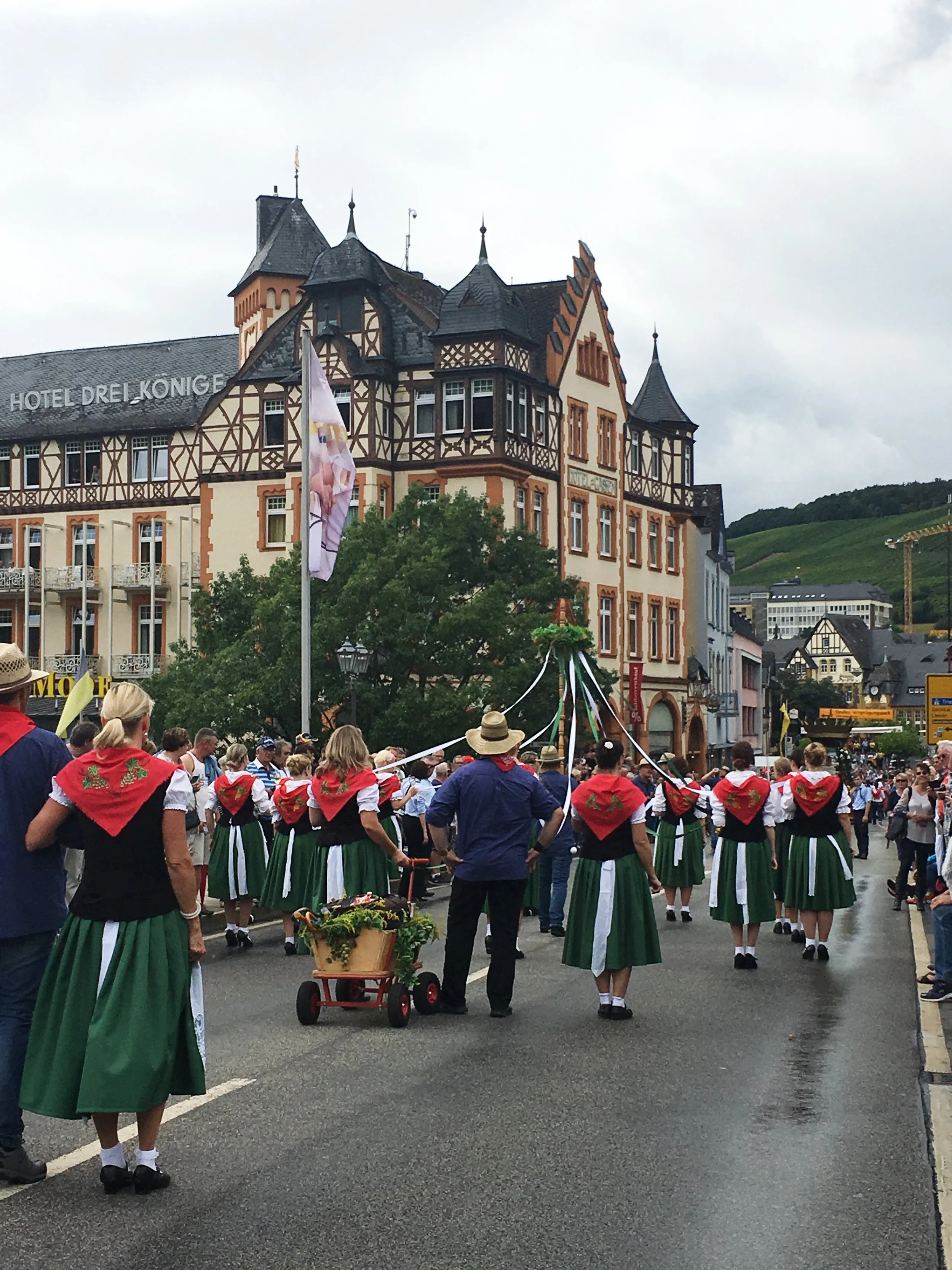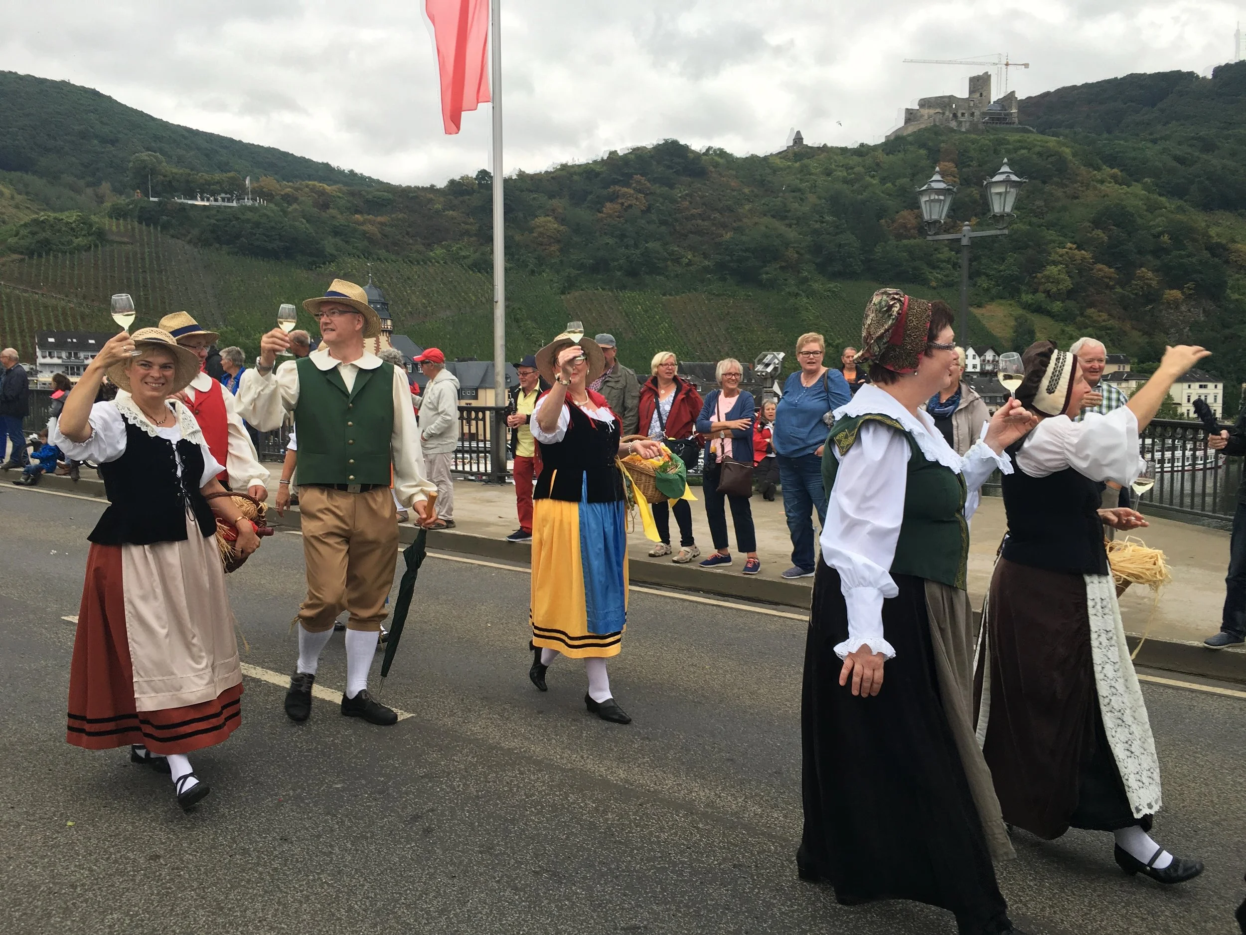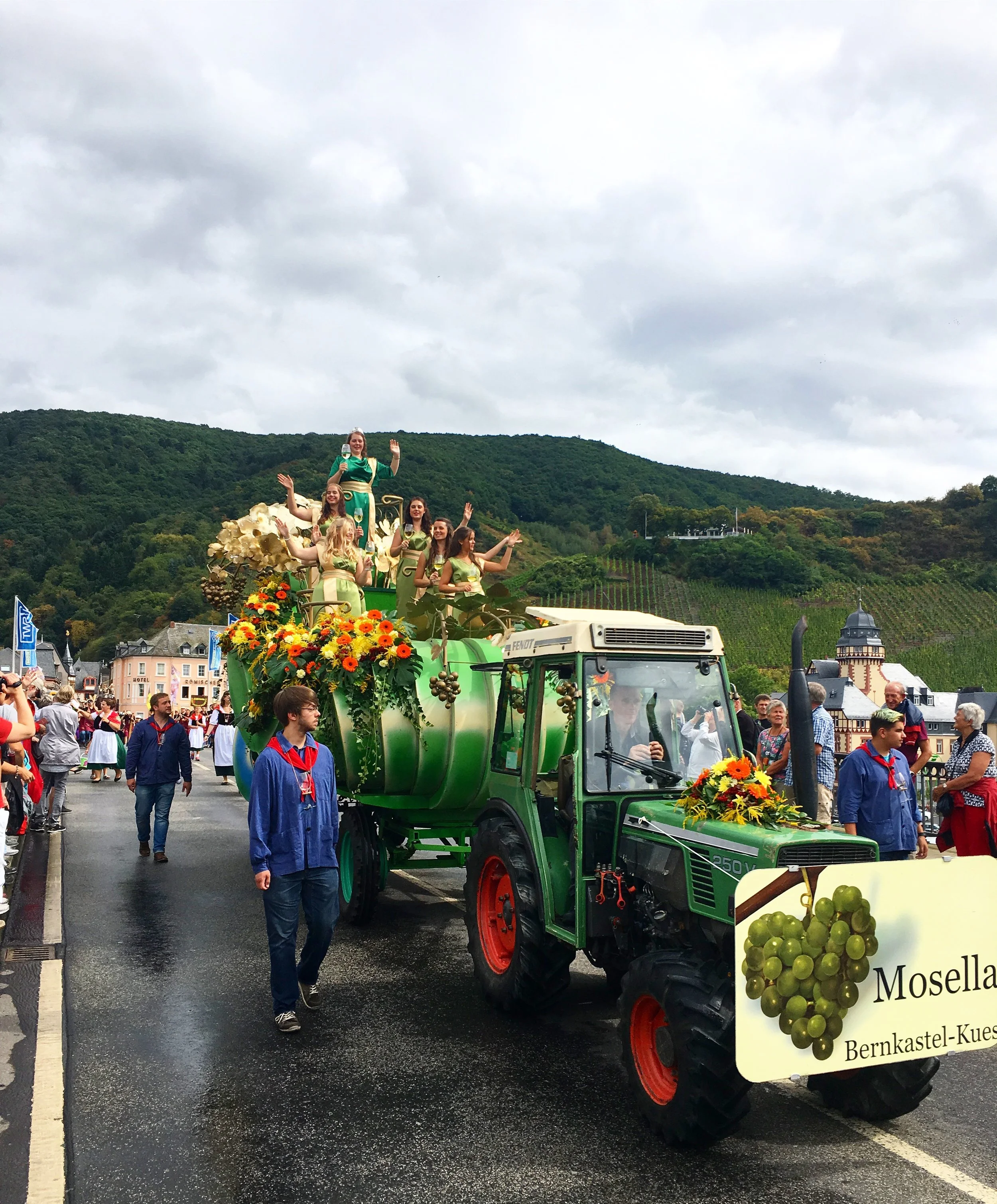 Sunday we were off to another wine festival in Burnkastel-Kues! The festival spans the weekend, but the PARADE is on Sunday! We all piled into Miss Pepper (huge car for another #WIN) and drove the hour and a half drive there. Unfortunately, another half hour was added on as we continued to get detoured all the way around our fist to get to our thumb. I guess with the parade routes and how the streets are closed for traffic, there is only one way to get in, and it was on the opposite side of how the GPS took us. But nonetheless we got there and about 10 minutes in the skies opened up and we got POURED ON. Luckily we are always prepared for any weather that might come our way, but it was still pretty wet. Later though, the weather totally cooperated and cleared up for the parade! The floats are all brought in by the surrounding vineyards, driven by tractors! The floats feature the wine princesses from that vineyard and are covered in flowers. Then the best part- people walk alongside the floats and fill up your glass with wine from that vineyard! It was so enjoyable, the weather turned crisp and cool and fun was had by all. Little Kinsley made out like a bandit, getting fresh bread, gummy bears and other trinkets from the parade participants. After the parade we wandered around, got some yummy fest food (brots, garlic bread, pretzels etc) and then met up with some other friends of Krista & Christy. We got rained on a bit more, but the worst of it was over and the remainder of the day was pretty low key.