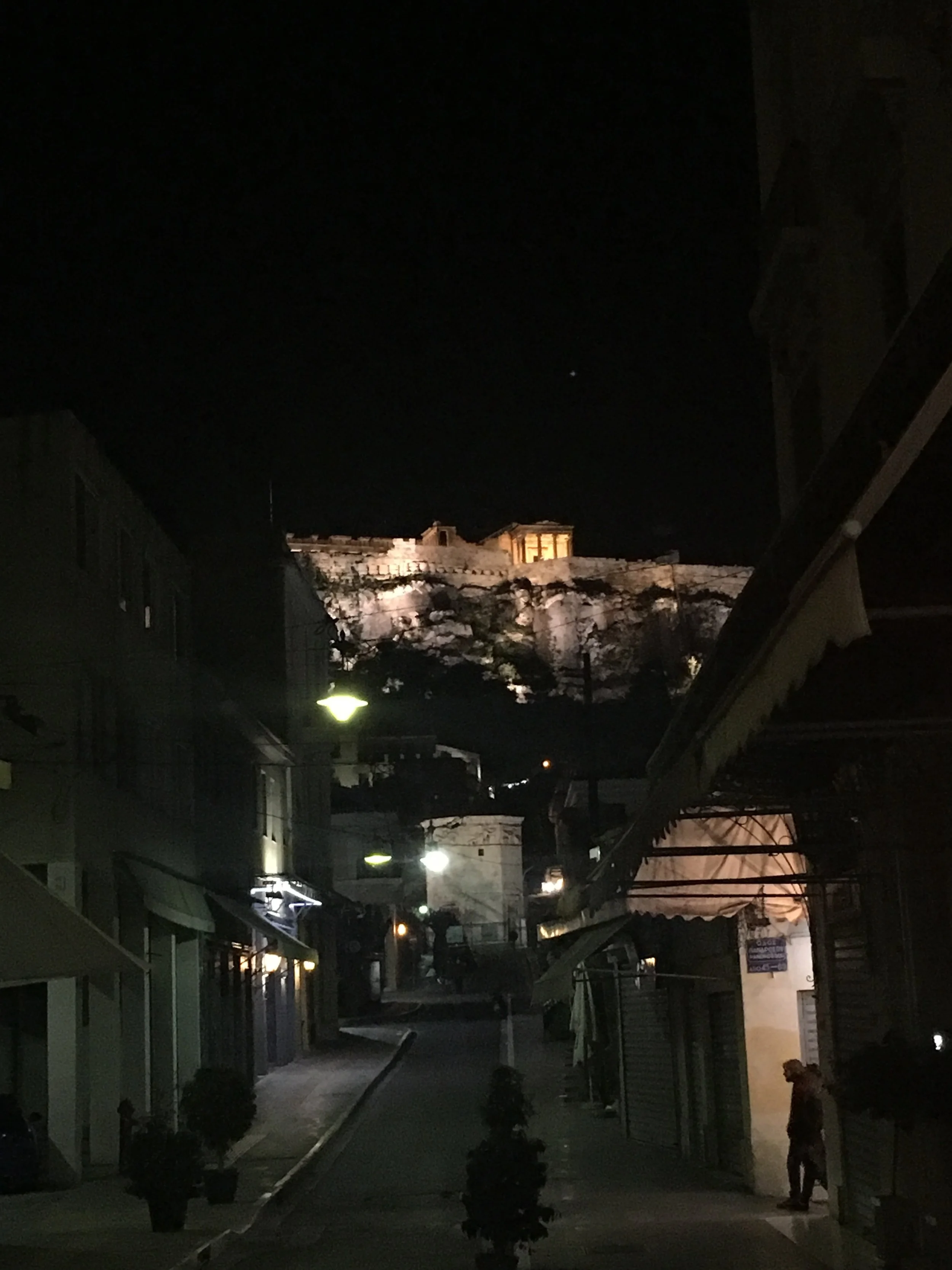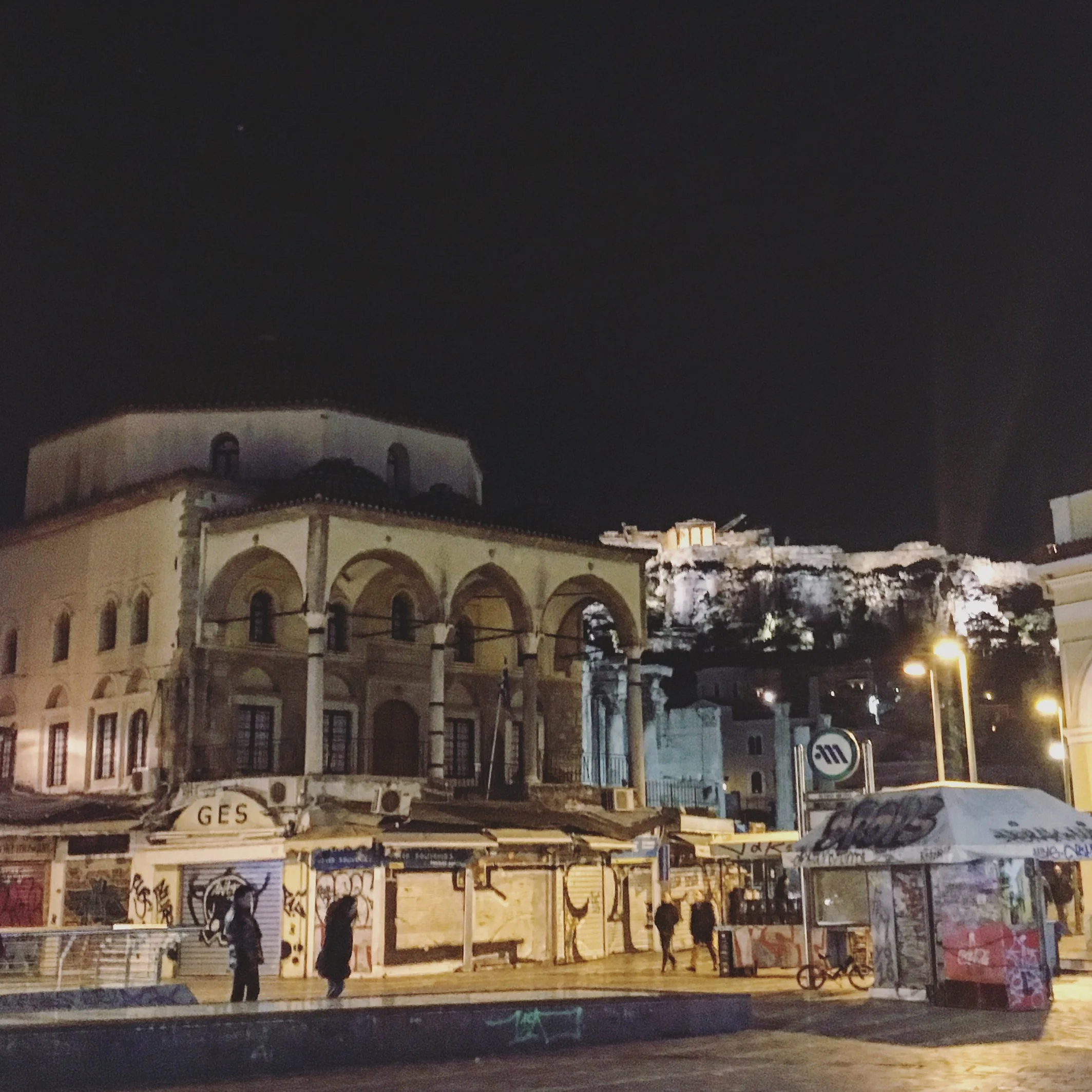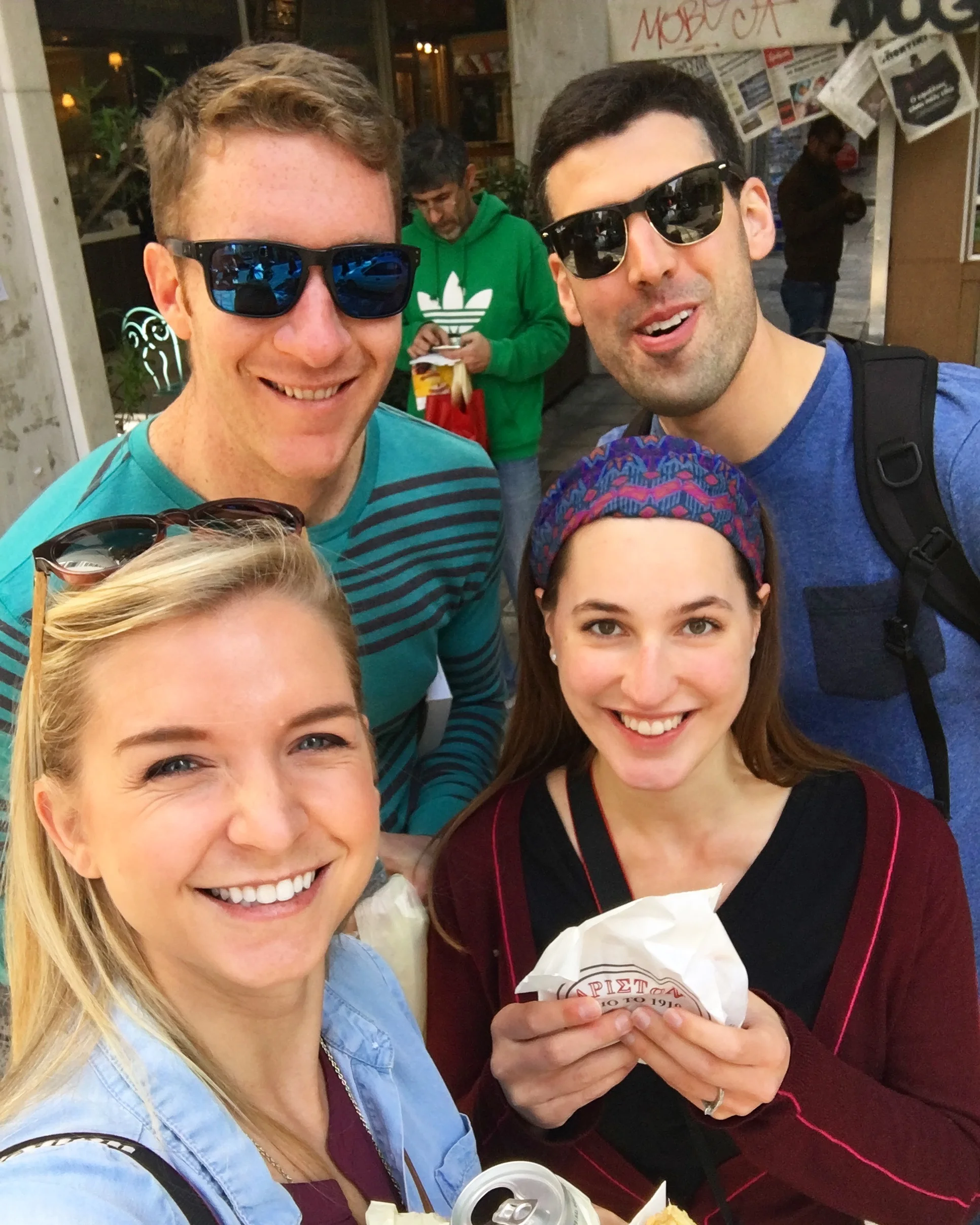 Thursday evening Michael and I were off! The best tickets we could find got us into Athens at 10pm so we flew in that night and Katie and Riley met us the next morning. Michael and I landed in Athens, hopped in an Uber and met our Air Bnb host, Stelios, close to midnight. He let us in to our private apartment just minutes away from the Acropolis and gave us a quick tour. Once we got settled we were off to explore Athens night life, worried it might be hard to find somewhere to eat dinner so late. Not only are they like most Europeans, a lively bunch late into the night, they were celebrating “pre-lent” by eating ALL THE MEAT, having BBQ’s, and going out for a week of revelry: drinking, dancing and enjoying the good things in life before lent started and restricted their fun. (Of course at the time Michael and I did not know WHY it was so exciting out, but just that we loved being a part of it!). We walked the 5 minutes to Monastiraki square and caught our first glimpse of the Acropolis all lit up. There were street vendors, skate boarders, bar-goers and everything in between. Even at midnight it was lively as ever. We wandered around until we found a string of restaurants offering outdoor seating- it was cool but not uncomfortable at all with a jacket. We snagged a table at one of the cafes and dove into a few Athens beers, some yummy sausage pastry and a gyro. We thought we would be closing the place down but people were still sitting down to order at 1am! After our late dinner we wandered around a bit more and stumbled upon this fantastic restaurant with live Greek music pouring out from it. There were streamers on the ground, evidence that something festive was happening, and it was pretty full, but we managed to grab a table and order a few drinks. Talk about people watching to the extreme: grown men taking the dance floor solo in tradition fluid Greek footsteps to the music, arms outstretched… a group of girls all dressed up enjoying their gal time… another table with an older crowd sitting around singing to the music… a girl dressed to the nines dancing on a chair for her boyfriend (I hope- ha!)… the entertainment was never ending! We posted up here for a while just taking it all in before the place started clearing out around 2am and we also decided to call it a night.
