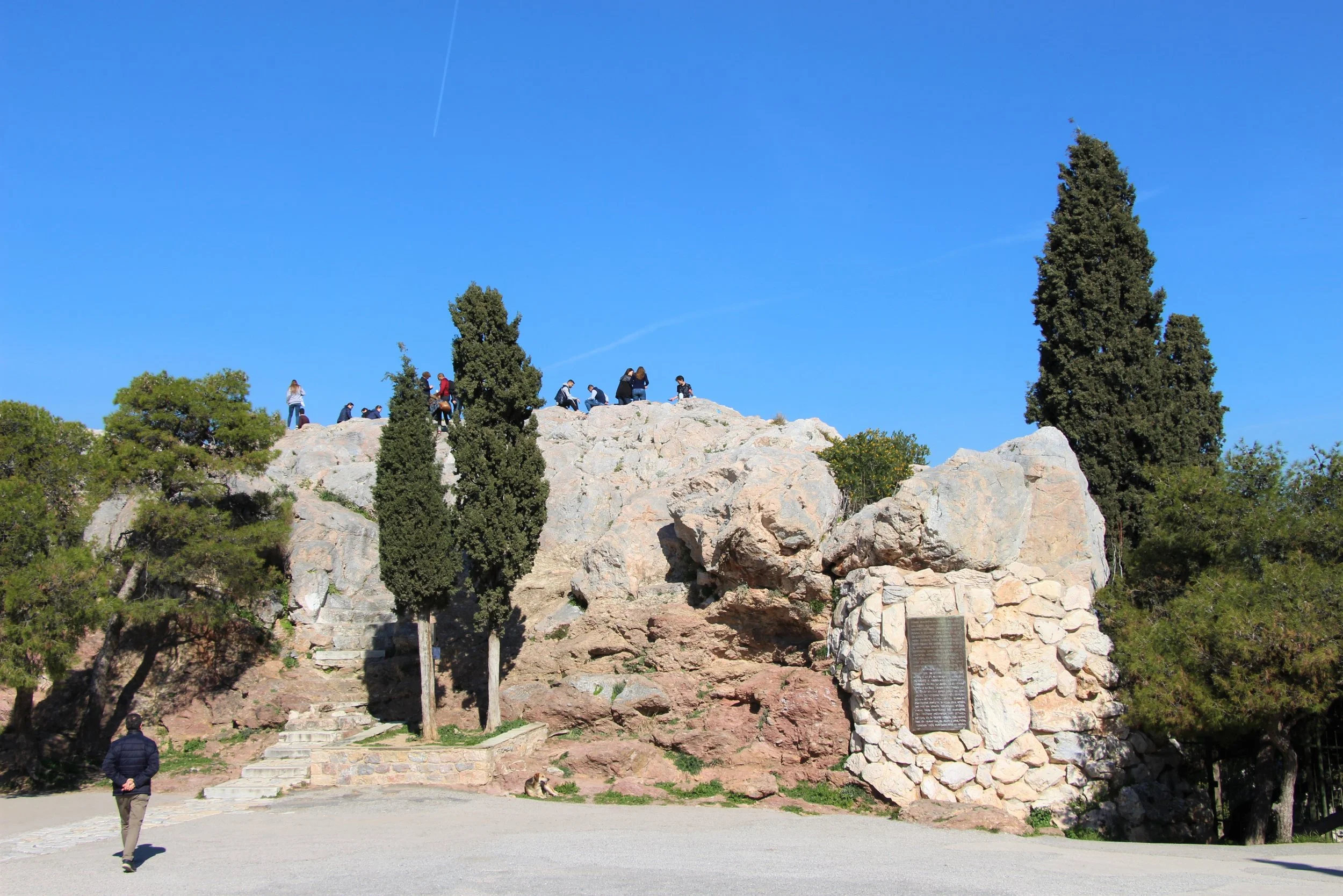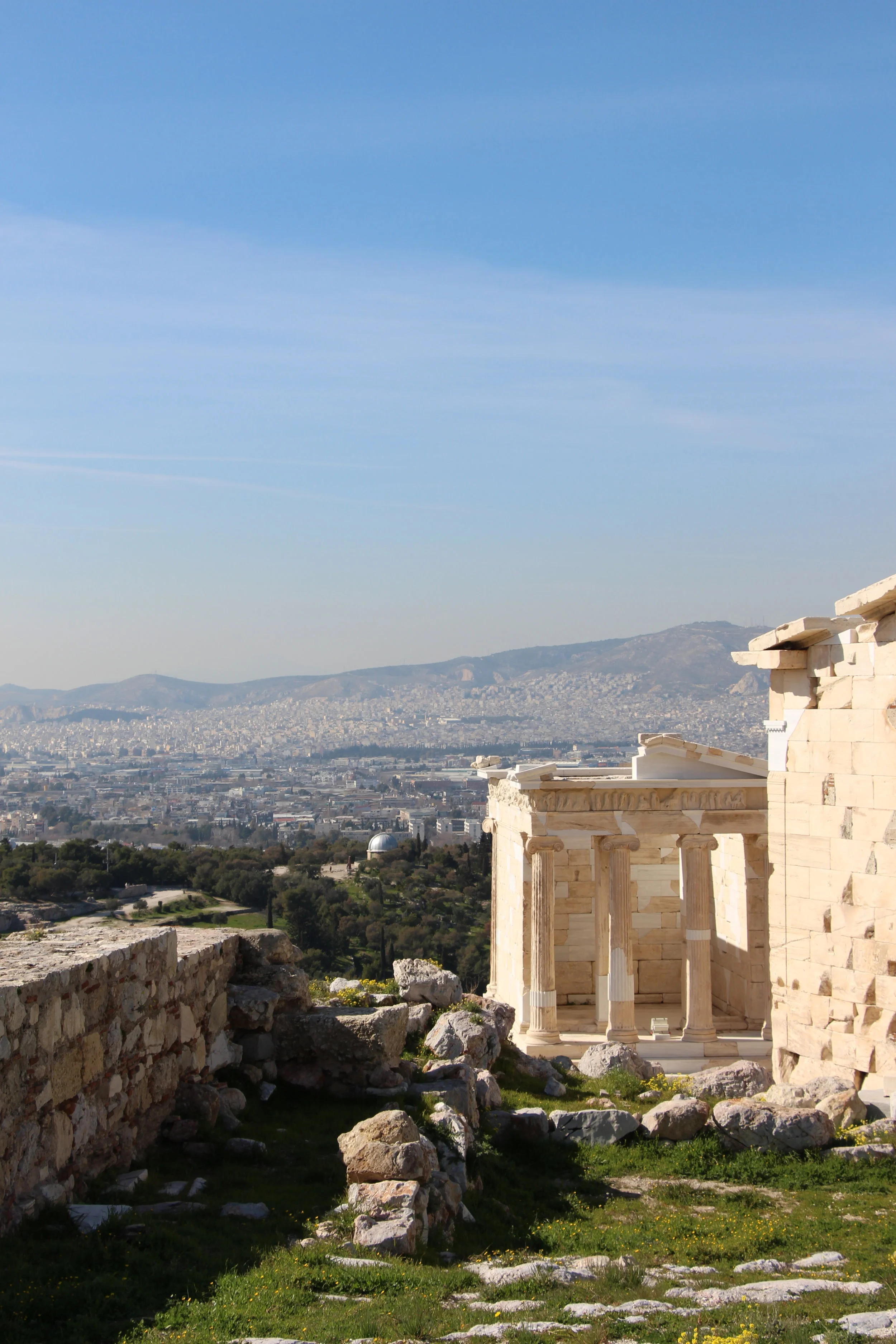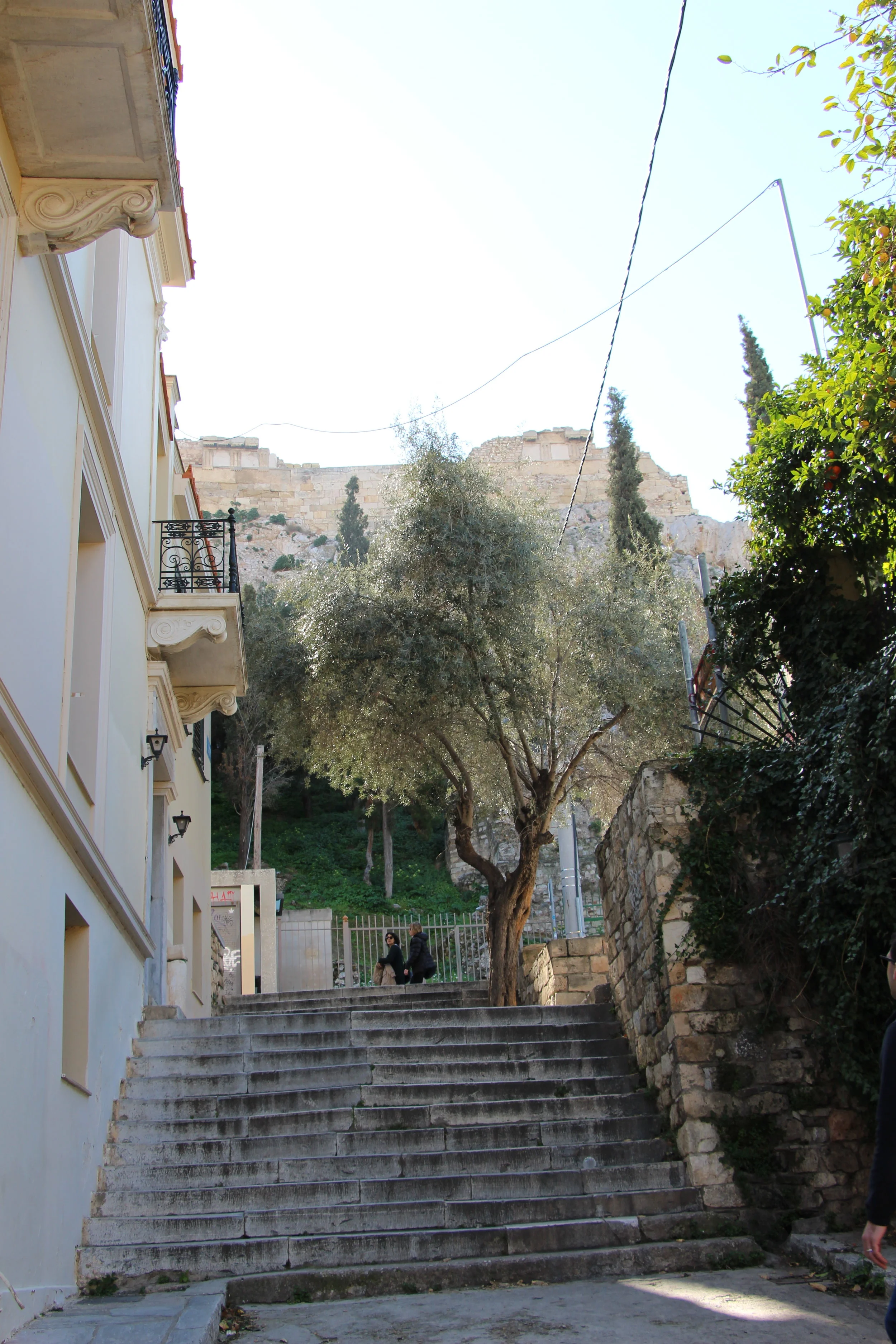 Friday morning, we were up bright and early to shower and get ready for the day and go scope out a grocery store for some breakfast. One of the points in which we were totally in agreement with the Livermore’s was the idea of cooking a few meals on the trip. Our Air Bnb’s each came with a kitchen so we were good to go! We made breakfast each morning and each agreed to cook one dinner. Michael and I found a great little store for dry goods, some cheese, spices etc. but could not find fresh fruit for sale anywhere! (Luckily when Katie and Riley arrived they had some fresh fruit with them which helped in the breakfast-making department.) We were so excited to see/meet them and our conversation was all over the place while we whipped up some breakfast and then headed out to the square to meet Effie- our fearless private tour guide we booked via Rick Steves’ recommendation. It was a wonder she was free knowing she can be booked MONTHS in advance, but this was one of our first perks of traveling in off season. We were greeted by this young, beautiful Greek woman clad in leather pants and jacket, pink off the shoulder top and luxurious straight brown hair that had me envious for hours. Needless to say, NOT what we expected, but she could not have been more warm and inviting and completely knowledgeable of all things Greece and Greek history. She took us up towards the Acropolis, stopping to point out and tell us about the Ancient Agora, Roman Forum and the Tower of the Winds. We wove through houses and souvenir shops before arriving at Mars Hill, where the Apostle Paul preached to the Athenians. Mars Hill sits right before the entrance to the Acropolis, but it is still a small hike up past the Odeon of Herodes Atticus- a huge outdoor theater that has been restored and still hosts famous outdoor concerts, to the grand entrance.