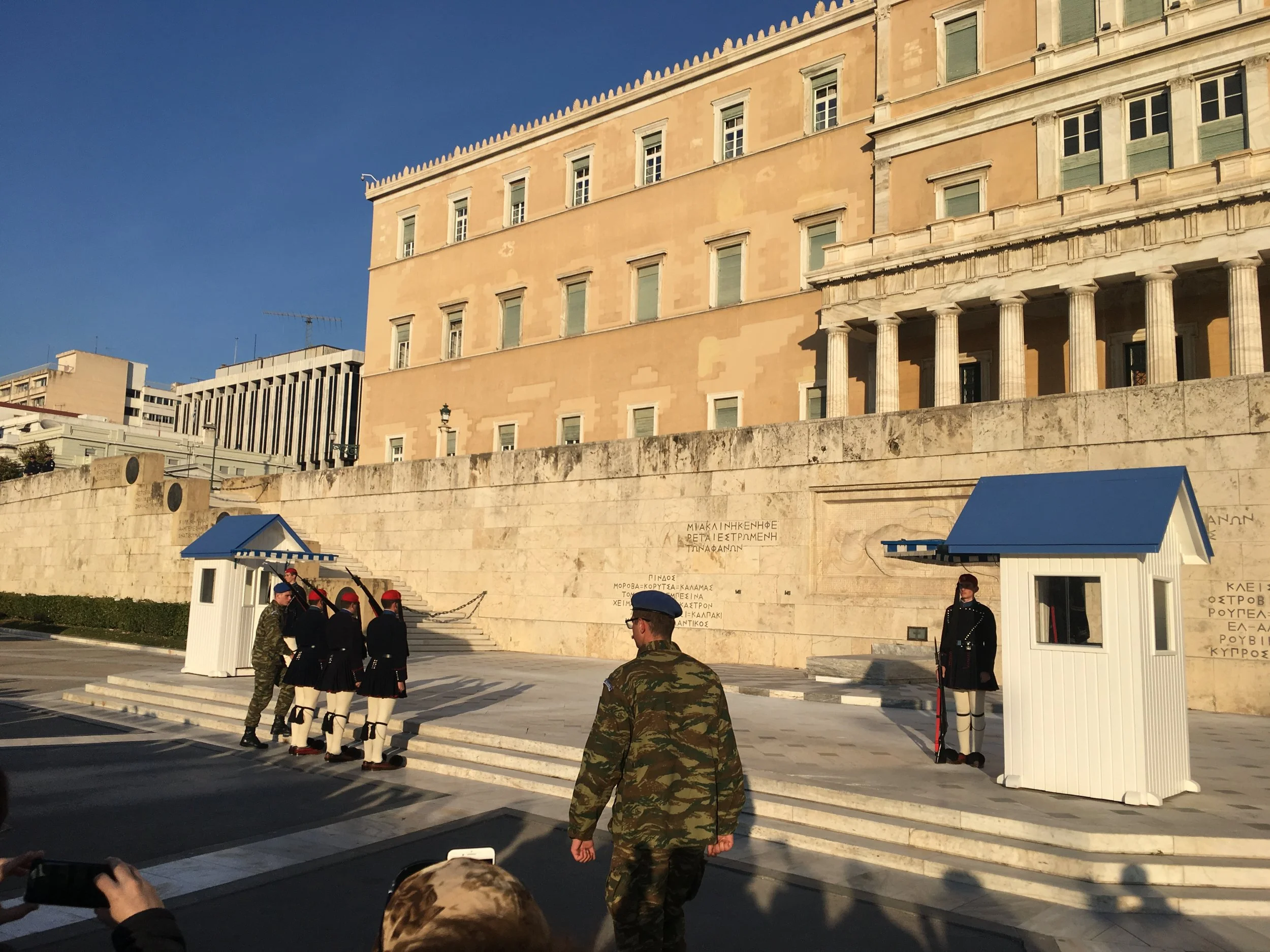 While it was a bit chilly, the sun was shining and there wasn’t a cloud in the sky. We ended up at a yummy Italian-ish restaurant where we enjoyed some open-face sandwiches and pasta! After lunch we meandered back, checking out some of downtown Athens. We saw the Parliament building and the changing of the guards which was pretty interesting. Their costumes were very odd- pom pom tassels on their shoes, super short kilt/skirts and tall, thick white stockings. Not exactly what you envision a nation’s military wearing, but apparently it’s a very traditional get up that “even their girlfriends and moms are proud of.” We knew we were doing a self-led Rick Steves’ city walk the next morning so we didn’t look too deeply into much else, just wandered around checking it all out.