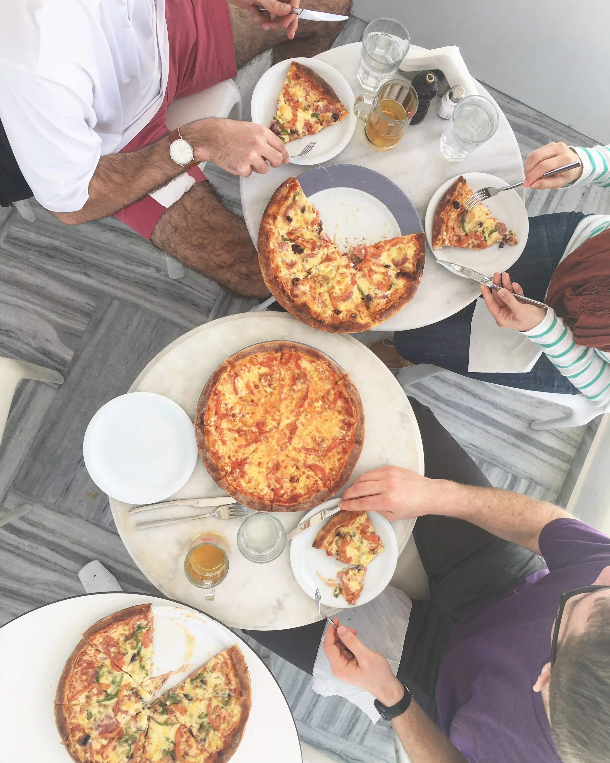 After taking in the view we were off to explore and find some grub for lunch! After our cab driver told us that all but 2 of the dinner restaurants in Oia would be closed for off season, we were a bit pessimistic about what we would find to eat. Luckily there were a few places still open including a bakery, a few tiny convenience/grocery stores and a delicious pizza joint where we posted up on the rooftop patio for lunch! We devoured all 3 of their pizza varieties in no time and reveled in the view before us. After lunch, we just wandered the island, taking it all in. One thing we learned was that major construction is only allowed on the island from October to March, the off-season. During this time a lot of the hotels, AirBnb’s and resorts close up shop to be worked on or renovated. This meant that while we were there, not only were the construction crews hustling to finish in their remaining 20 days, it also meant that 75% of the population on the island were construction workers, leaving about 20% tourists and 5% people who actually live there and run their tourist-centered businesses. (At least in Oia that is what we experienced.) While there was a good deal of construction going on, it was mild on Sunday compared to the loud banging and clatter we woke up to on Monday where the construction crews were at full steam. All that said, we honestly feel traveling off-season was the way to go. We traded intense heat and “Grand-Central-Station-like crowds” for a bit of construction noise and fewer restaurant options.