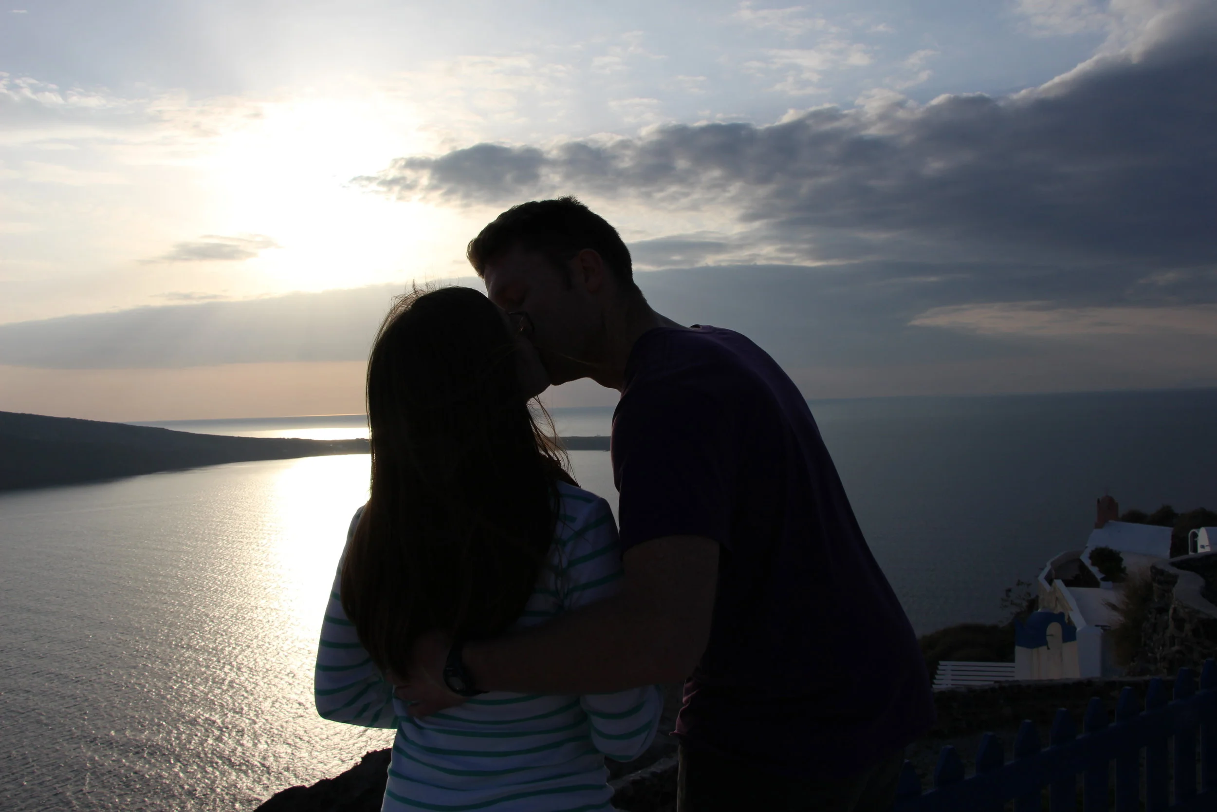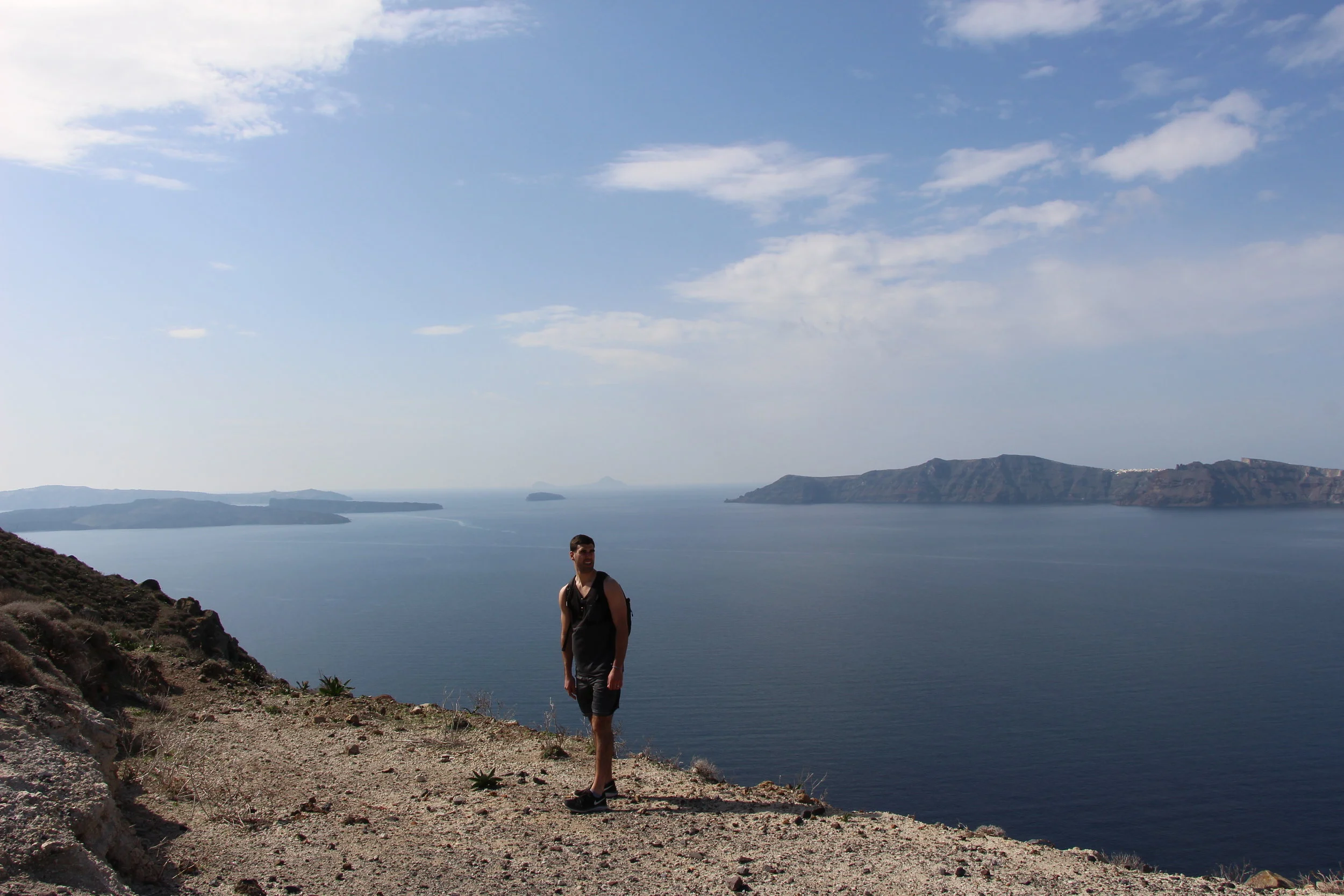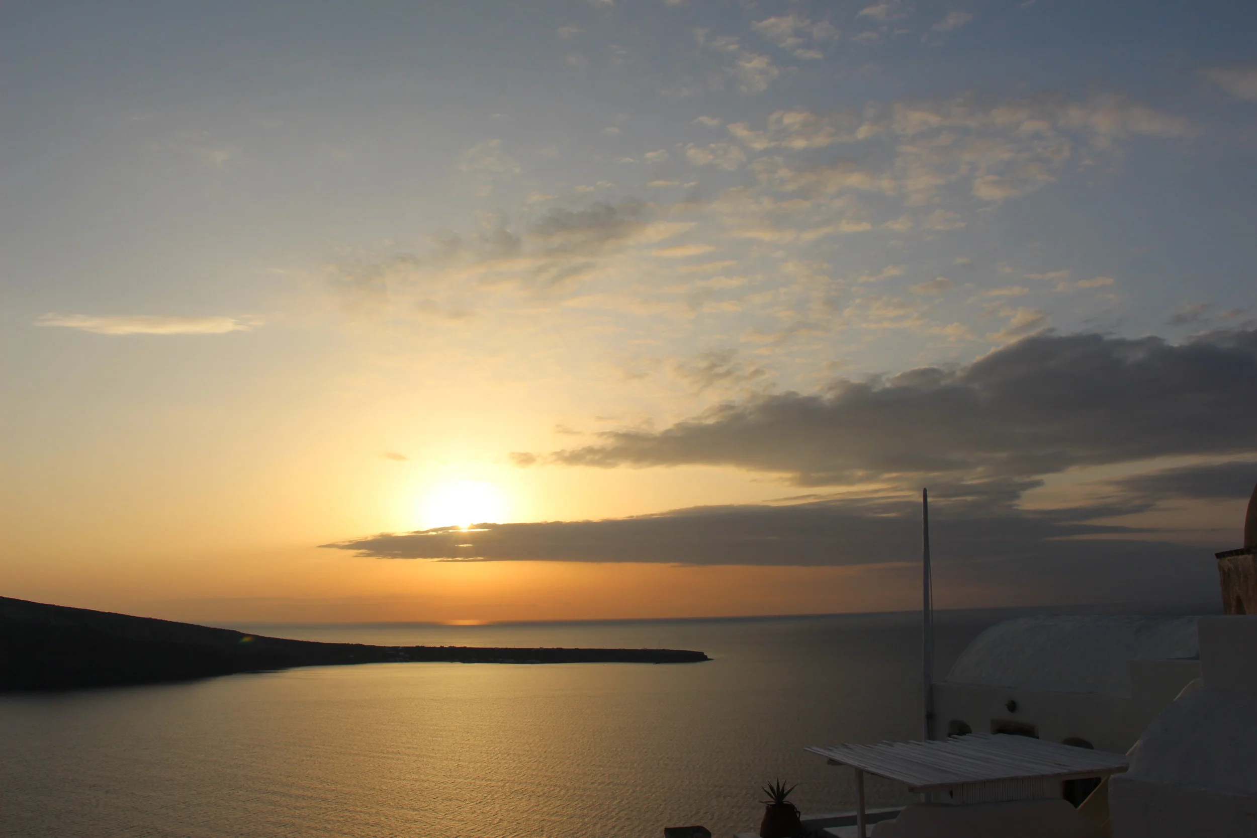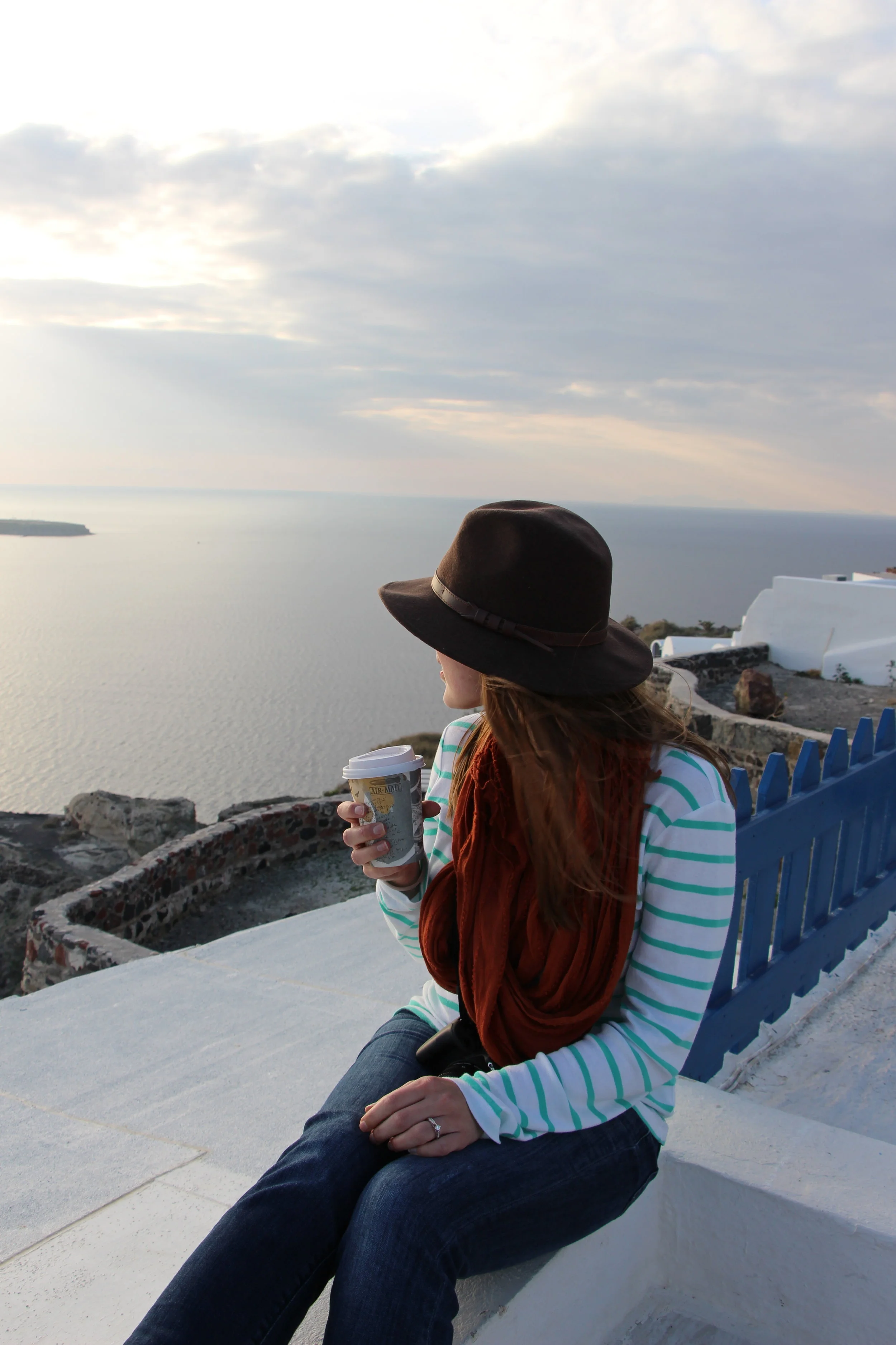 Sunday evening, we headed to the western side, north around the tip of Oia where we were staying, and scoped out the perfect spot for the sunset. As we were wandering around it was clear tourists from all over the island were arriving to do the same thing, although we heard in the summer it gets absolutely PACKED, so we were lucky to be able to take it easy. It is tricky at some points to really know if you are on a public pathway or if you have just stumbled onto someone’s patio, the way everything is jigsaw puzzled together. At one point we were invited in by one peculiar hippie looking woman to her patio for drinks and a sunset view. After wandering around and not finding a much better spot to post up, and being tempted by the thought of a warm drink (The sun was nice and warm but as it set the breeze picked up and it started getting chilly) so we took her up on her offer knowing there had to be a catch, but maybe it would be worth it? She was selling homemade yarn bracelets and henna tattoos from her patio, which of course we had no interest in. She greeted us warmly and told us there was a really nice patio on her roof if we wanted to check it out. We popped on up there and sat on the lone bench to what was actually a pretty awesome view of the sunset, but not really a great view looking back at the island itself, which we knew would be beautiful as it was lit by the setting sun. So we decided to have a quick drink, give her a little tip, snag a few pics and be on our way. She was kind enough to serve us from her selection of coffee, hot chocolate and wine which we enjoyed amid our little sunset photo shoot, where we were able to grab some nice shots. Then… the hook, line and sinker. She came up with a bill for the drinks- 6 Euro each! HA! So those were the most expensive drinks we enjoyed in Santorini. We are still trying to figure out how she did that and how she can possibly run a legal café out of her home when she comes back up with her yarn bracelets. She explains that she is in fact NOT a café and so we paid for one of her bracelets each. This just keeps getting better and better. So we are each asked to pick out a bracelet from her display, which we do even though we know we will never wear these things again, pay our “bill” and decided to get the hell out of dodge and find a better, more peaceful and less expensive place to watch the sunset.