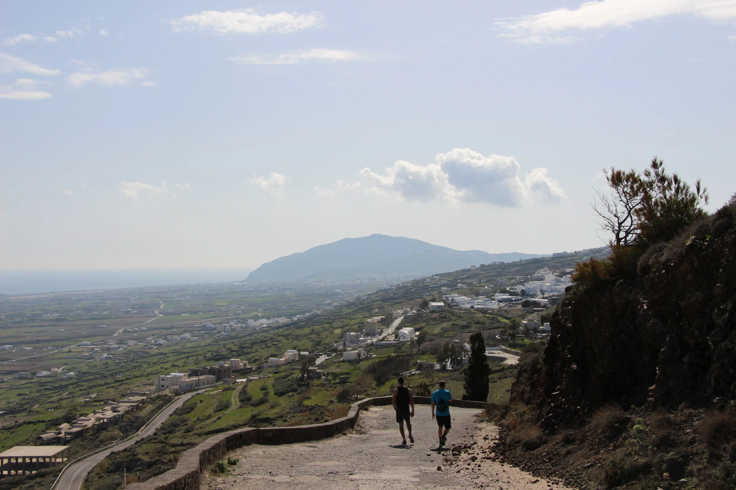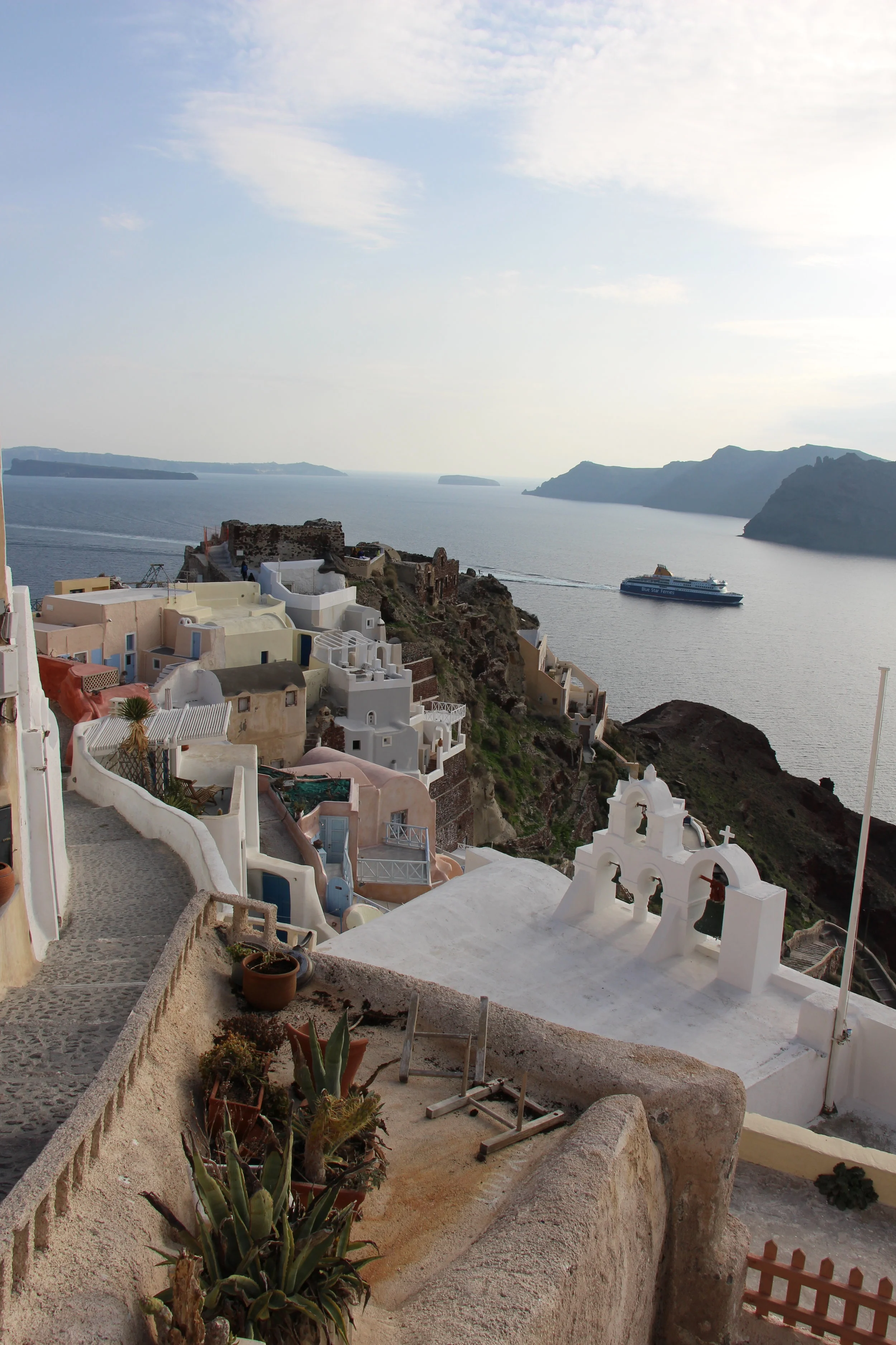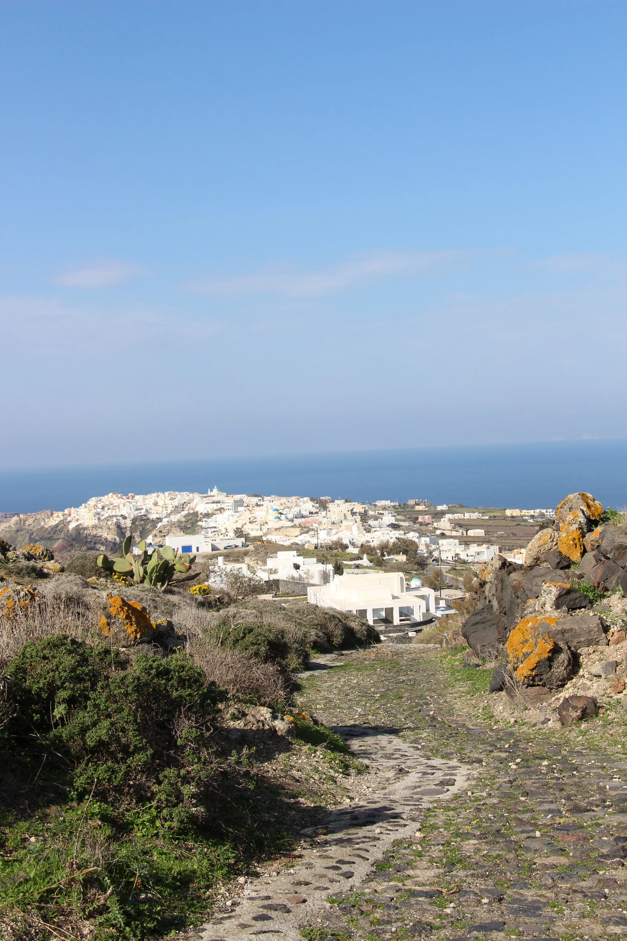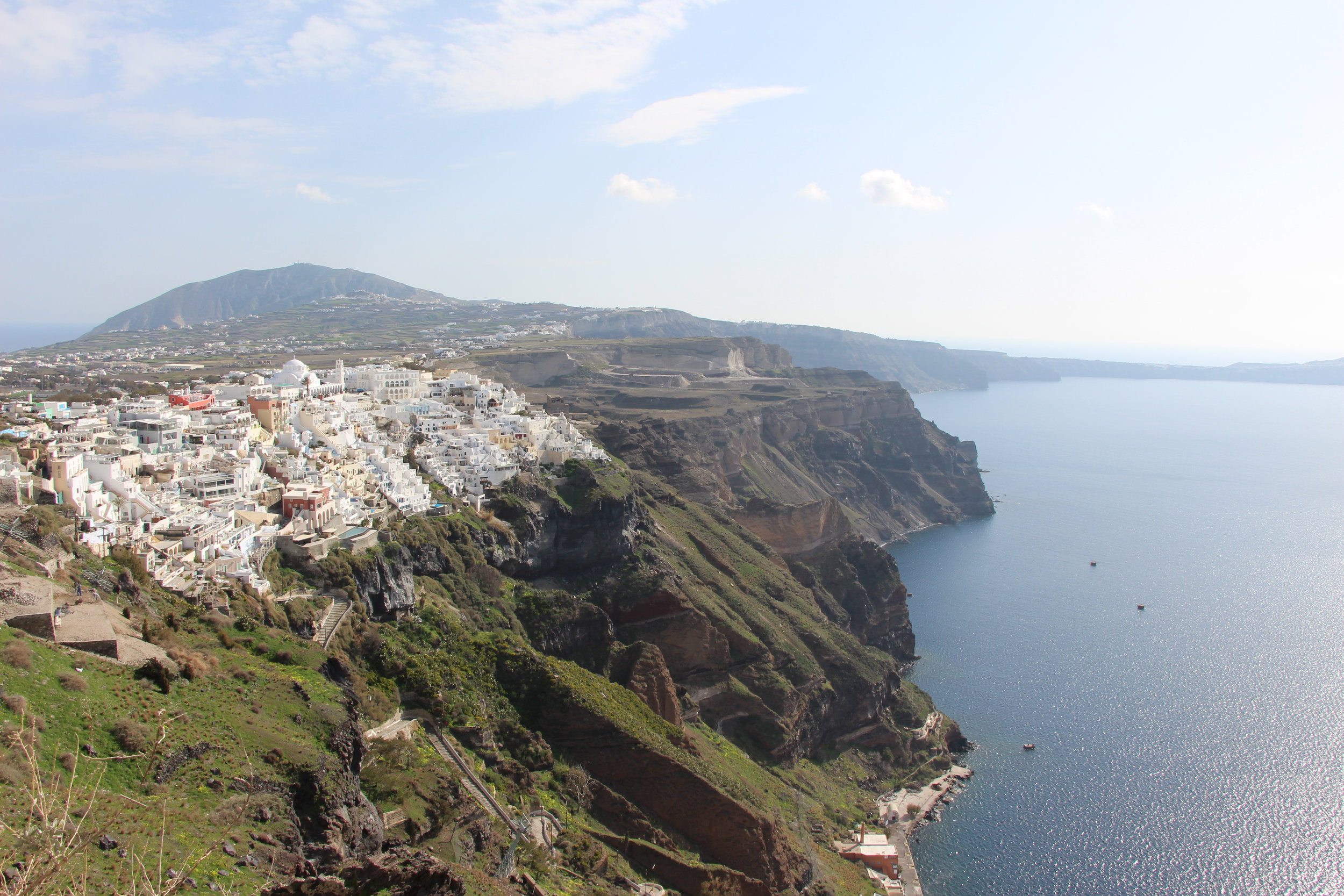 Monday morning we awoke to the many harsh sounds of construction on Santorini. While it was not all that pleasant, we traded it for the crazy crowds that fill the Oia streets in the summer, which to us felt like a pretty fair trade. After a delicious breakfast of fruit, oatmeal, eggs, warm pita bread with honey and hot tea we threw on our tennis shoes, packed our bags with snacks and headed out on what was the highlight of our trip: the hike from Oia to Fira. Most people hike from Fira to Oia, but being that we were staying in Oia, we opted to do it “backwards” and end with lunch in Fira before taking a bus or cab back to Oia that afternoon. The hike was quite a bit uphill for the first half, but not too challenging overall. The views were absolutely spectacular. I felt like every 5 minutes of the hike the view changed completely. It started up the black lava rock cliffs towards the singular white chapels nestled in their hills, watching Oia fade away in the background. Rounding the corner of the cliff led to pockets of really nice looking villas and resorts, tucked away from the main towns with fantastic views of the caldera. At some points you wander through small towns, down their narrow streets just to pop out again with an amazing view. It took us 2 hours to get to Skaros Rock- this barren rock outcropping just a short walk down from the town of Imerovigli. We stopped on this rock to eat our snacks: nuts from Israel, big purple grapes, Edam Cheese, and of course our outstanding Greek olives. It was the perfect pick me up to continue our hike around the rock, eventually working our way up up up (about a thousand steps) back to the mainland and then another 25 minutes or so to Fira. The weather was absolutely perfect for us, just cool enough with the warm sun shining in a nearly cloudless sky.