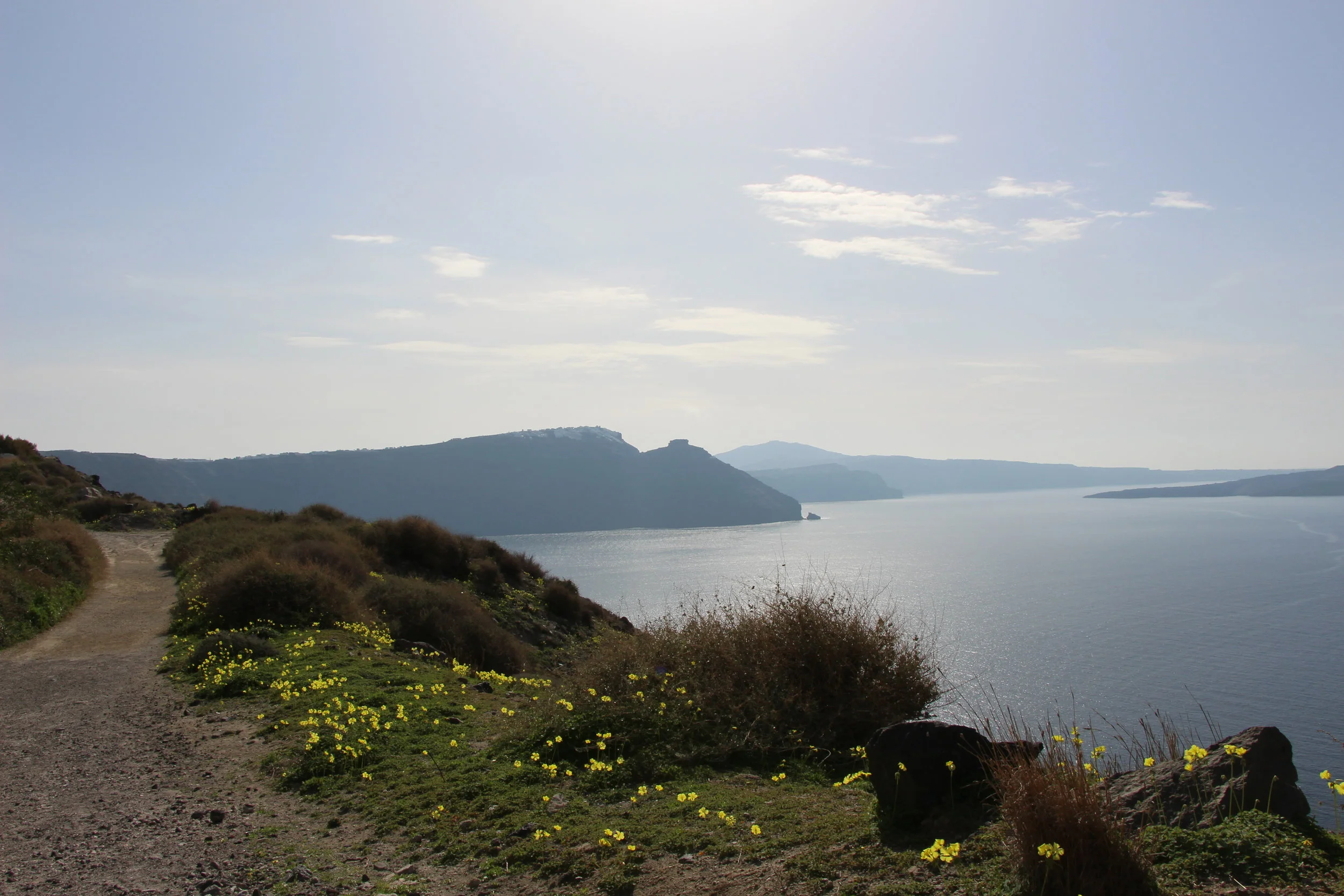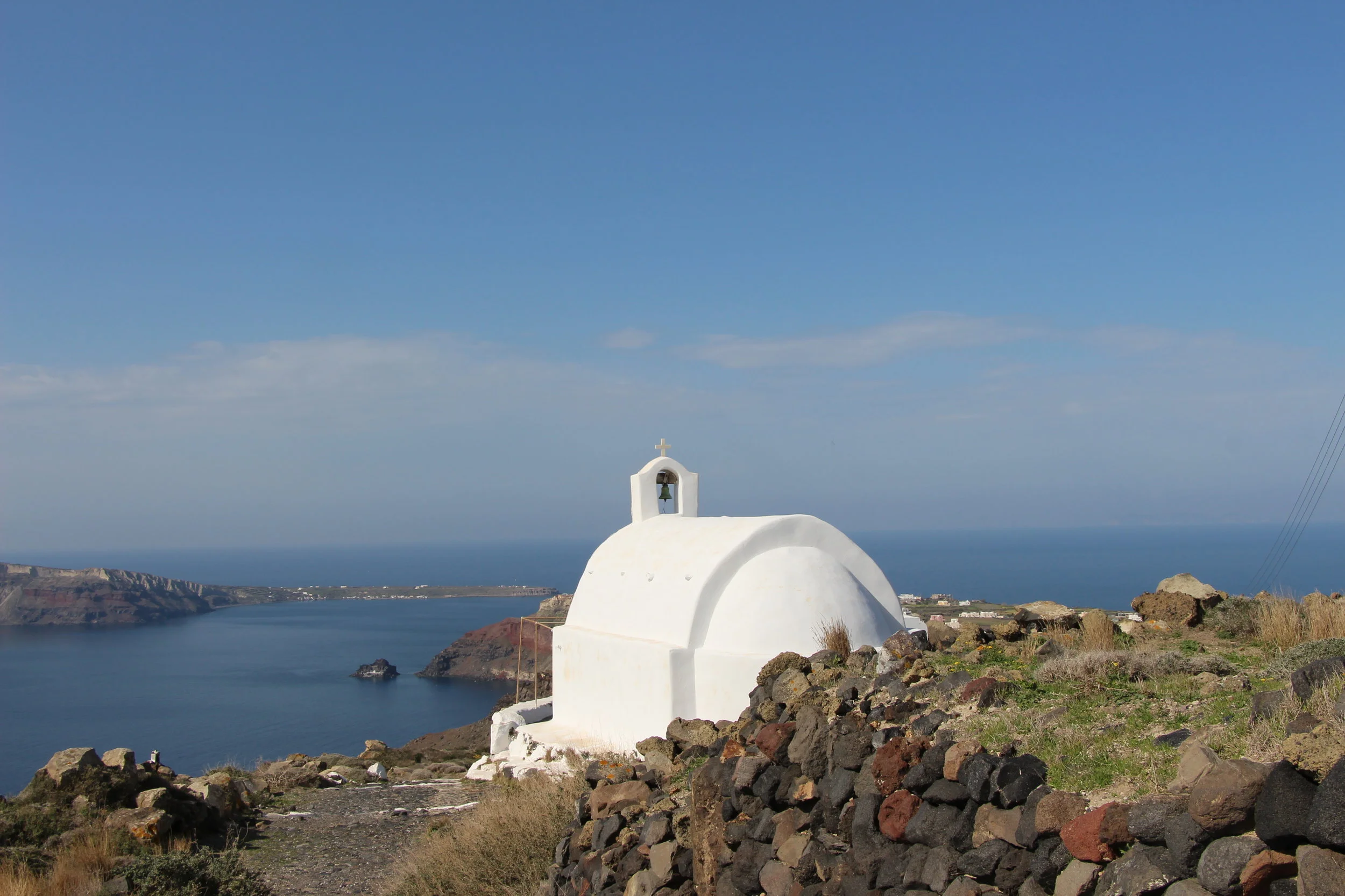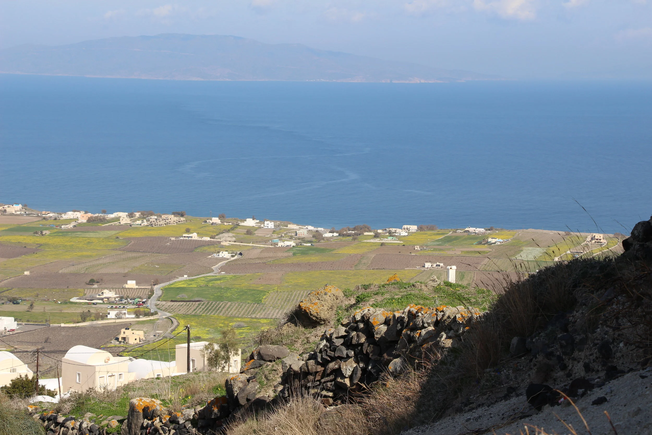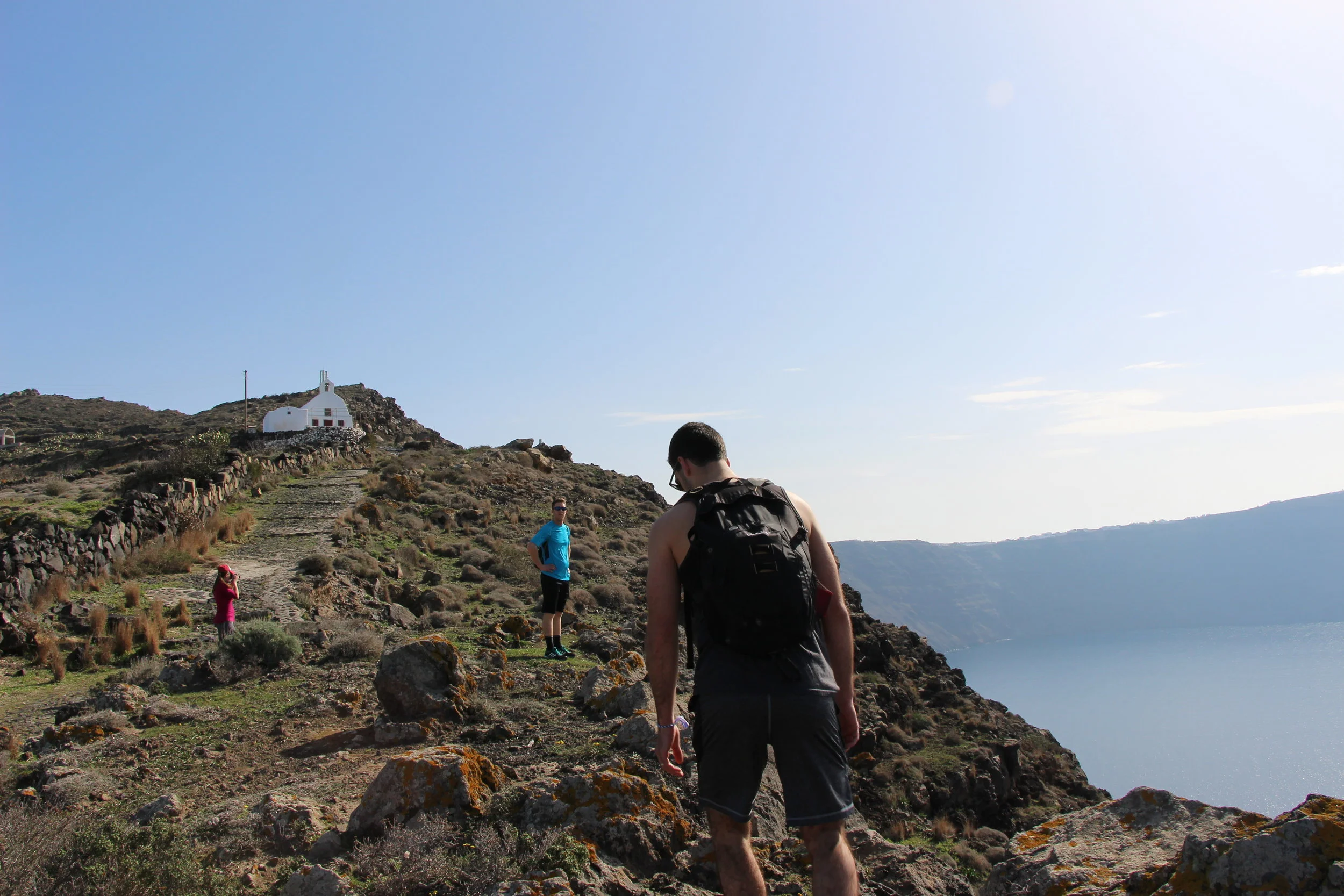 Monday morning we awoke to the many harsh sounds of construction on Santorini. While it was not all that pleasant, we traded it for the crazy crowds that fill the Oia streets in the summer, which to us felt like a pretty fair trade. After a delicious breakfast of fruit, oatmeal, eggs, warm pita bread with honey and hot tea we threw on our tennis shoes, packed our bags with snacks and headed out on what was the highlight of our trip: the hike from Oia to Fira. Most people hike from Fira to Oia, but being that we were staying in Oia, we opted to do it “backwards” and end with lunch in Fira before taking a bus or cab back to Oia that afternoon. The hike was quite a bit uphill for the first half, but not too challenging overall. The views were absolutely spectacular. I felt like every 5 minutes of the hike the view changed completely. It started up the black lava rock cliffs towards the singular white chapels nestled in their hills, watching Oia fade away in the background. Rounding the corner of the cliff led to pockets of really nice looking villas and resorts, tucked away from the main towns with fantastic views of the caldera. At some points you wander through small towns, down their narrow streets just to pop out again with an amazing view. It took us 2 hours to get to Skaros Rock- this barren rock outcropping just a short walk down from the town of Imerovigli. We stopped on this rock to eat our snacks: nuts from Israel, big purple grapes, Edam Cheese, and of course our outstanding Greek olives. It was the perfect pick me up to continue our hike around the rock, eventually working our way up up up (about a thousand steps) back to the mainland and then another 25 minutes or so to Fira. The weather was absolutely perfect for us, just cool enough with the warm sun shining in a nearly cloudless sky.